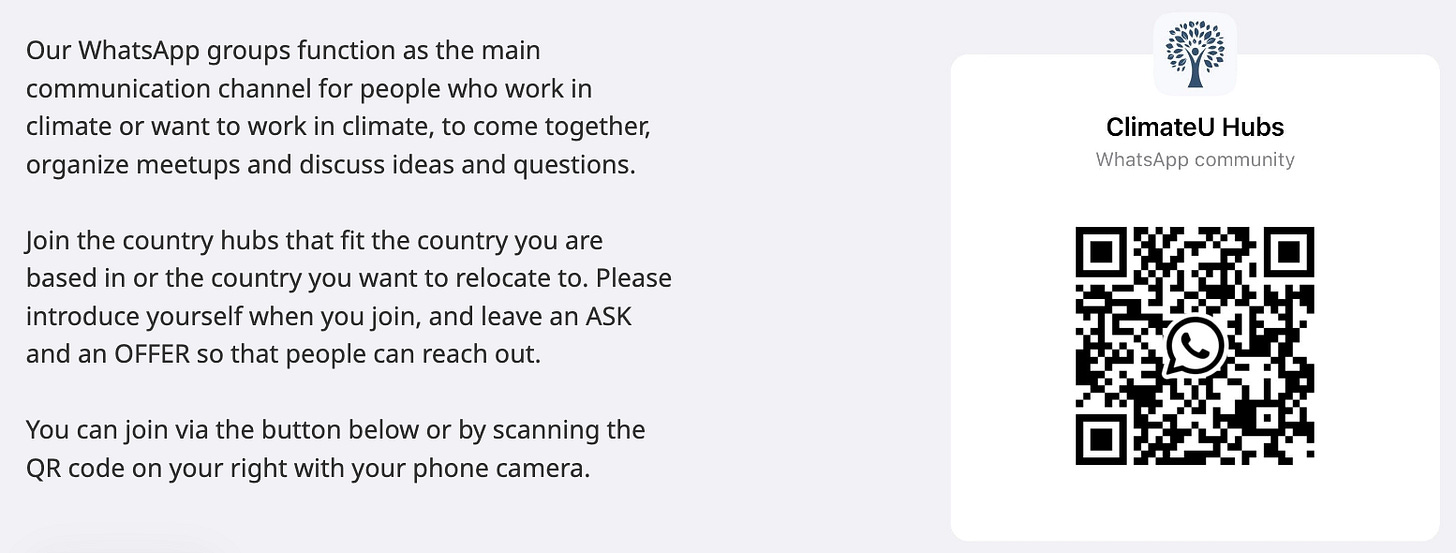 The country hubs are multiple WhatsApp groups within one large WhatsApp community. There is one group for each country that has a large climate-tech community. We also added a group for broader regions that havenât been as present on ClimateU yet (LATAM, MENA, etc.) You can simply join the countries or regions that are relevant to you. These groups are the main communication channel to reach people within your ecosystem and are meant to drive in-person events and discussions that are self-organized by the members. Weâre already seeing the first meetups in Lisbon, Berlin, Hamburg, London, Vienna, and Barcelona coming together.